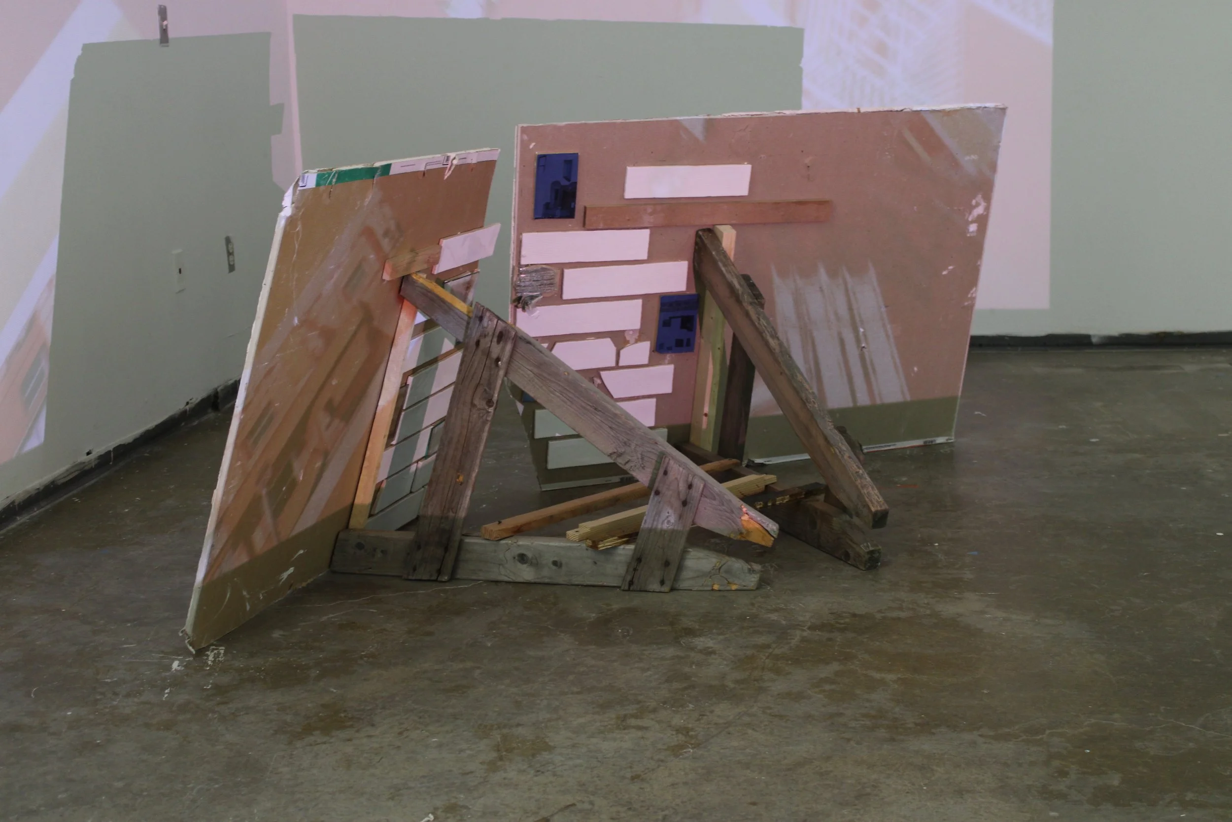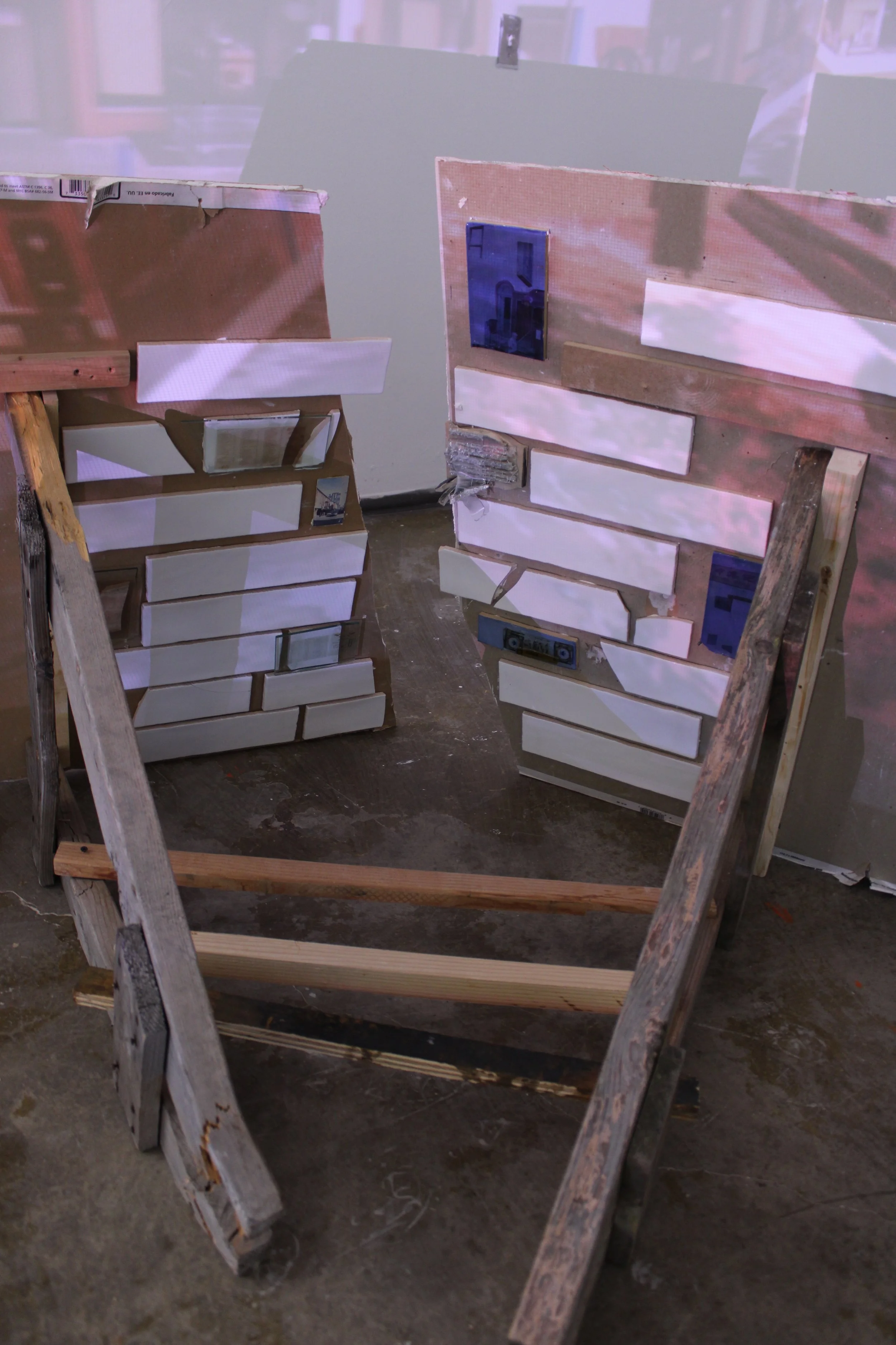 Reclaimed drywall and wood, pre-fab ceramic tiles, glass, slip, projection